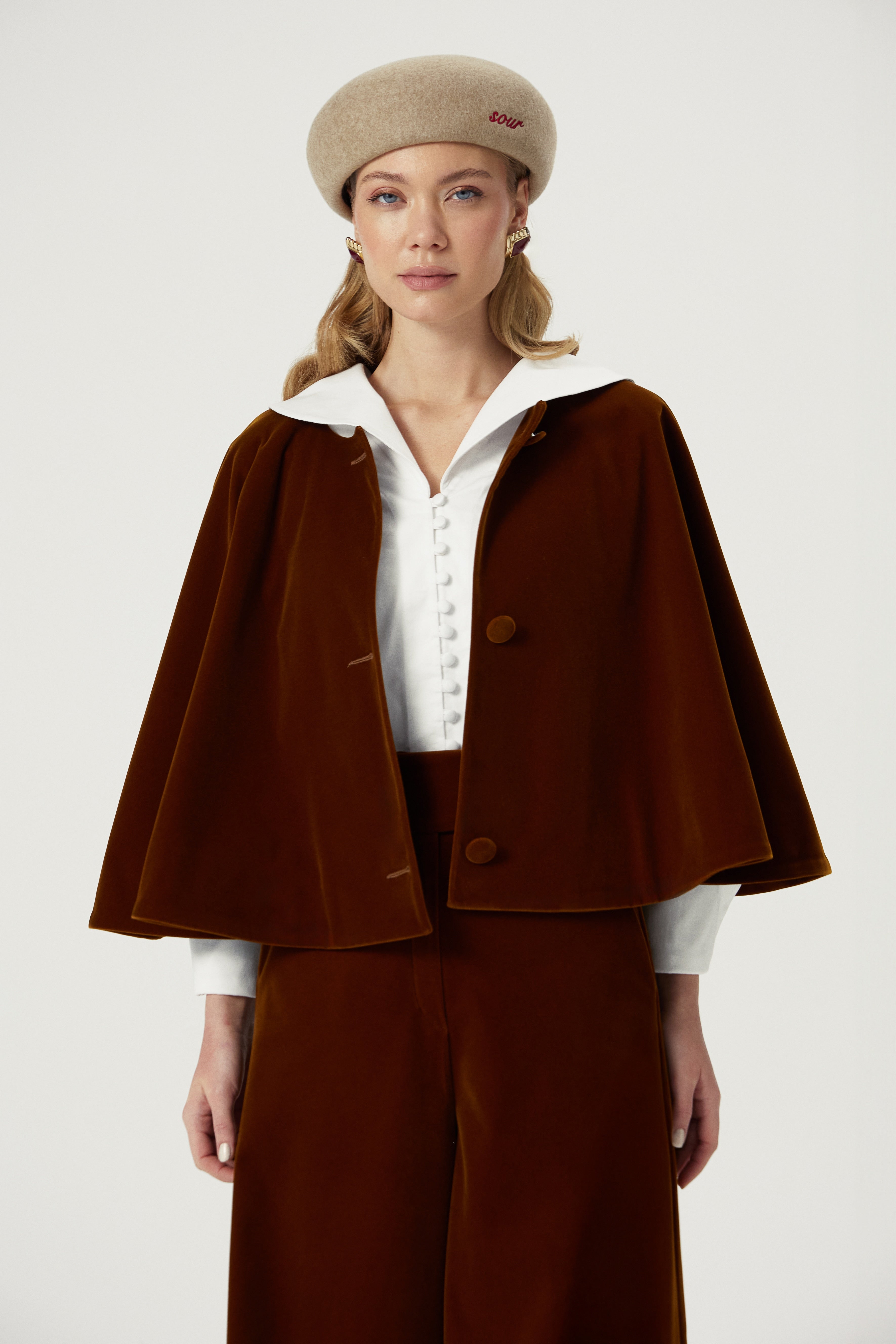 Sour Mélange tek beden astarlı pelerin, kahverengi tonu ve astarlı yapısıyla gardırobunuzda katmanlı kullanım için net bir seçenek sunar. Günlük şehir temposunda ya da akşam serinliğinde kolayca tamamlayıcı parça olarak kullanılabilir.