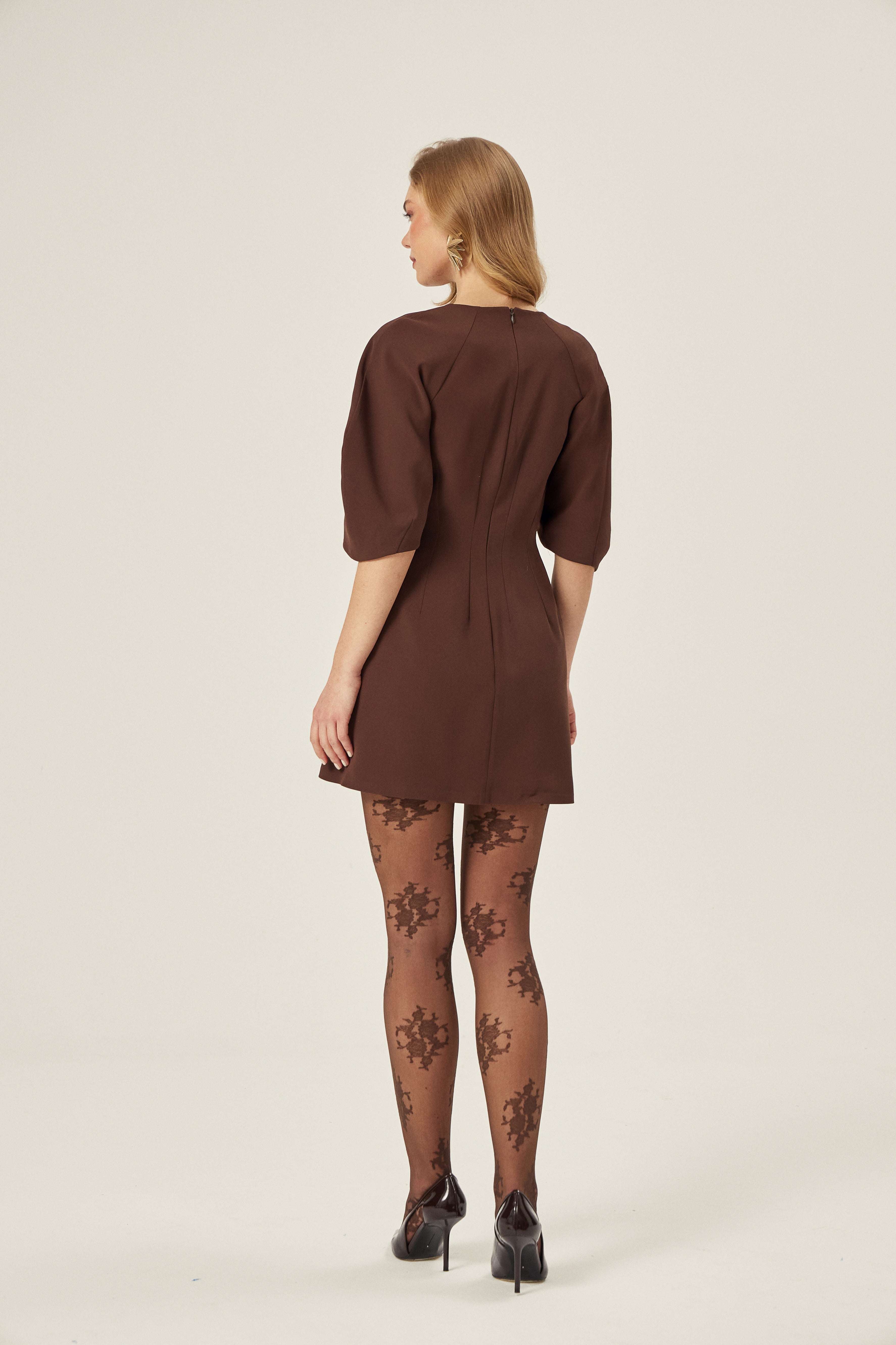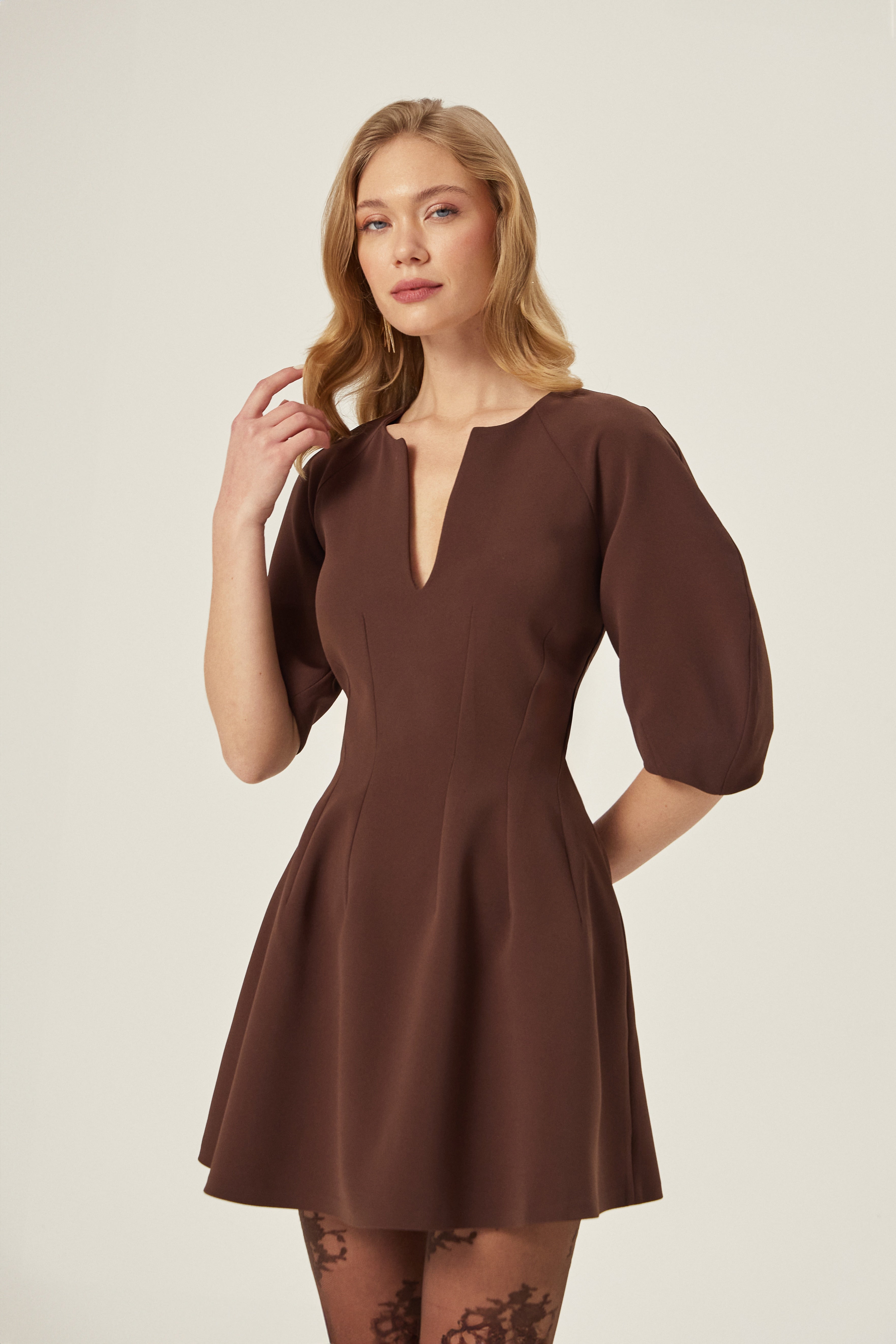 Gardırobuna net bir siluet eklemek isteyenler için: kahverengi balon kollu krep elbise. Krep dokunun dengeli duruşu ve balon kol detayı, minimal bir görünümde hacim etkisi yaratır. Gün boyu şehir temposundan akşam planına geçişte tek parça ile tamamlanır.