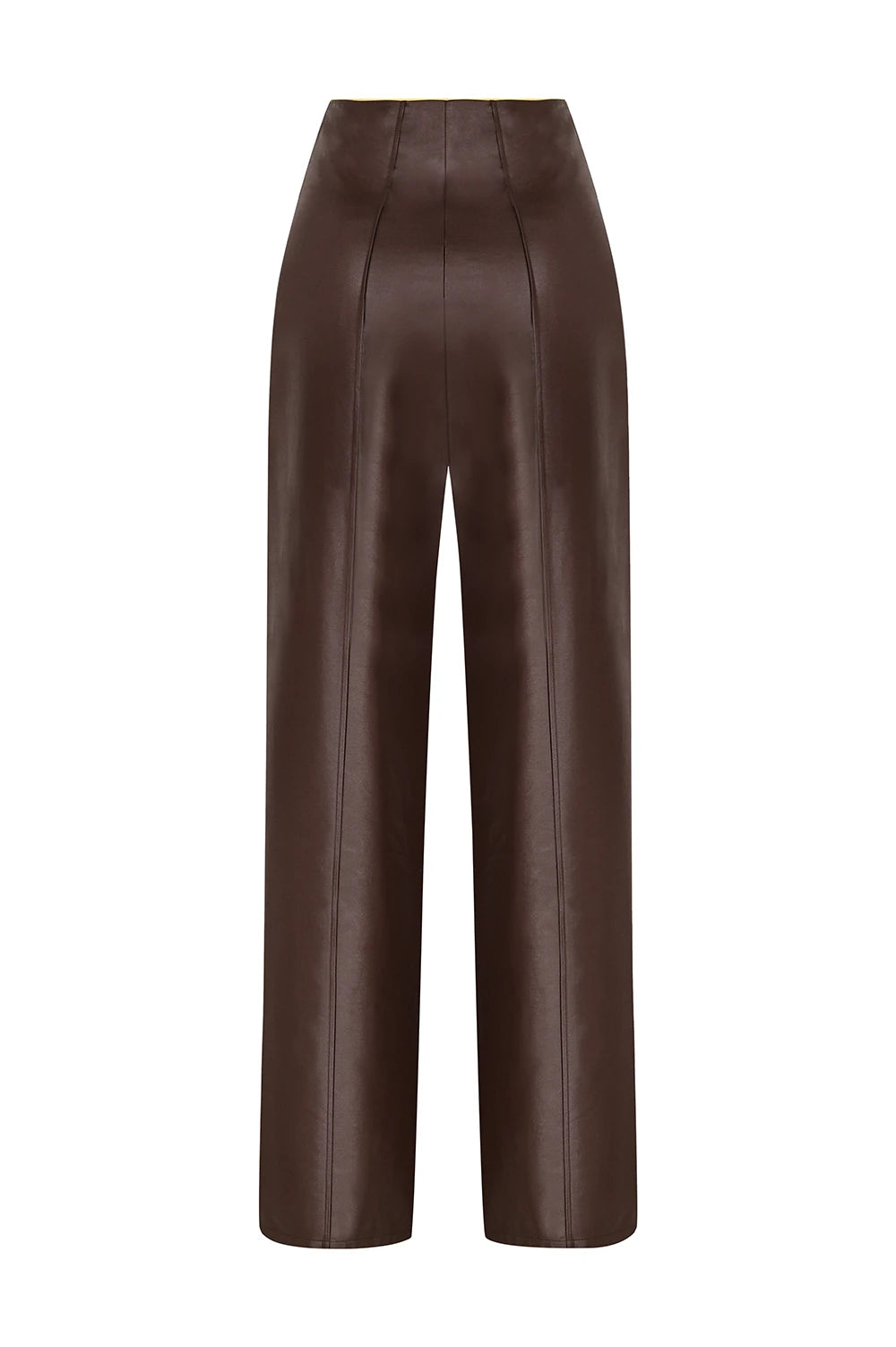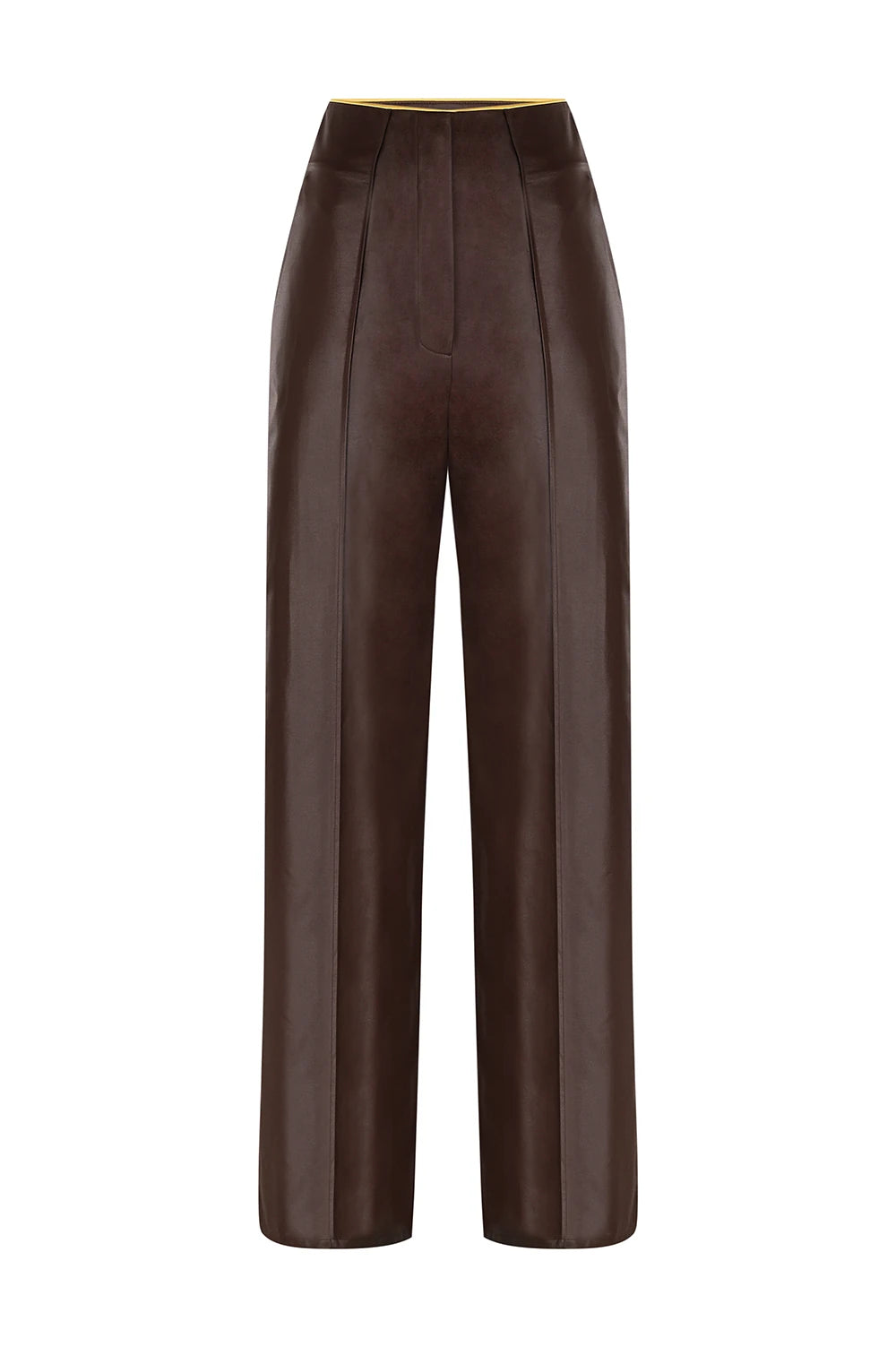 VESERA Pantolon, pamuk ağırlıklı deri dokulu kumaşı ve kahverengi zemin üzerindeki sarı biye detayıyla net, modern bir duruş sunar. Düz ve rahat kesimi gün içine uyum sağlar; planlar değişse de görünüm aynı çizgide kalır.