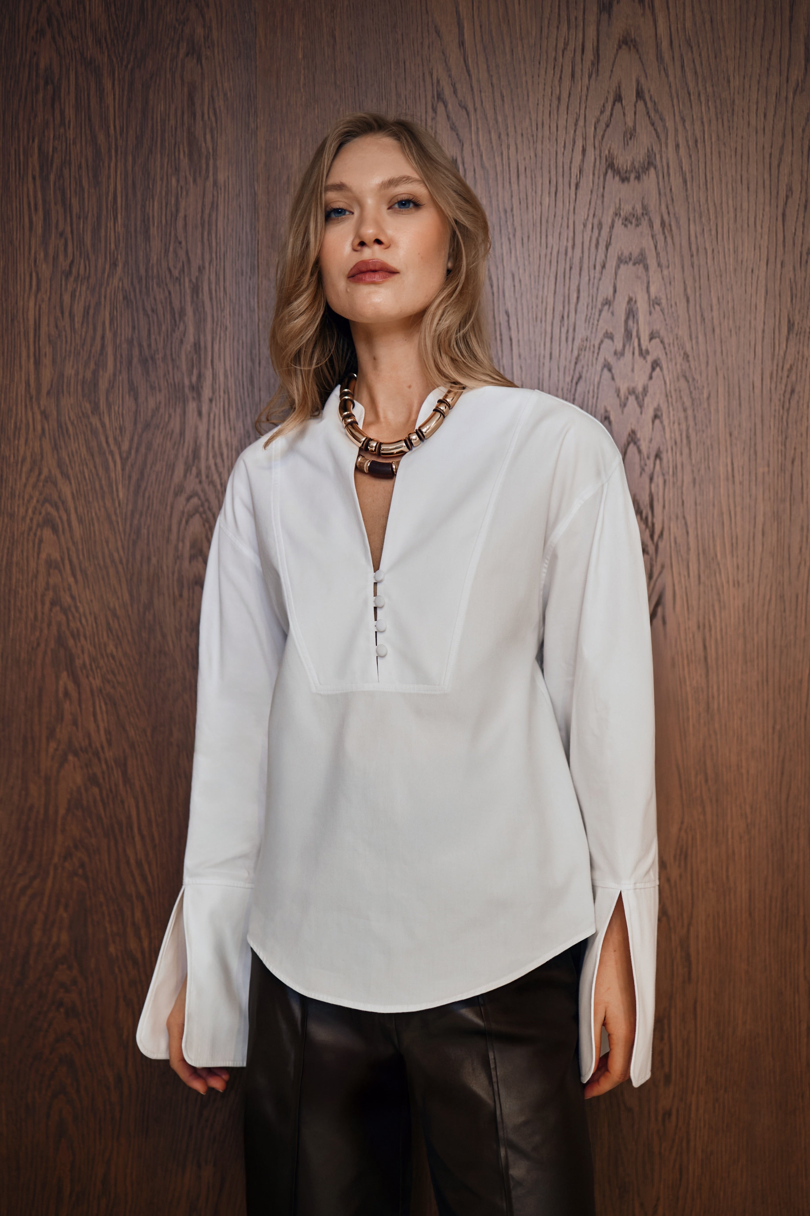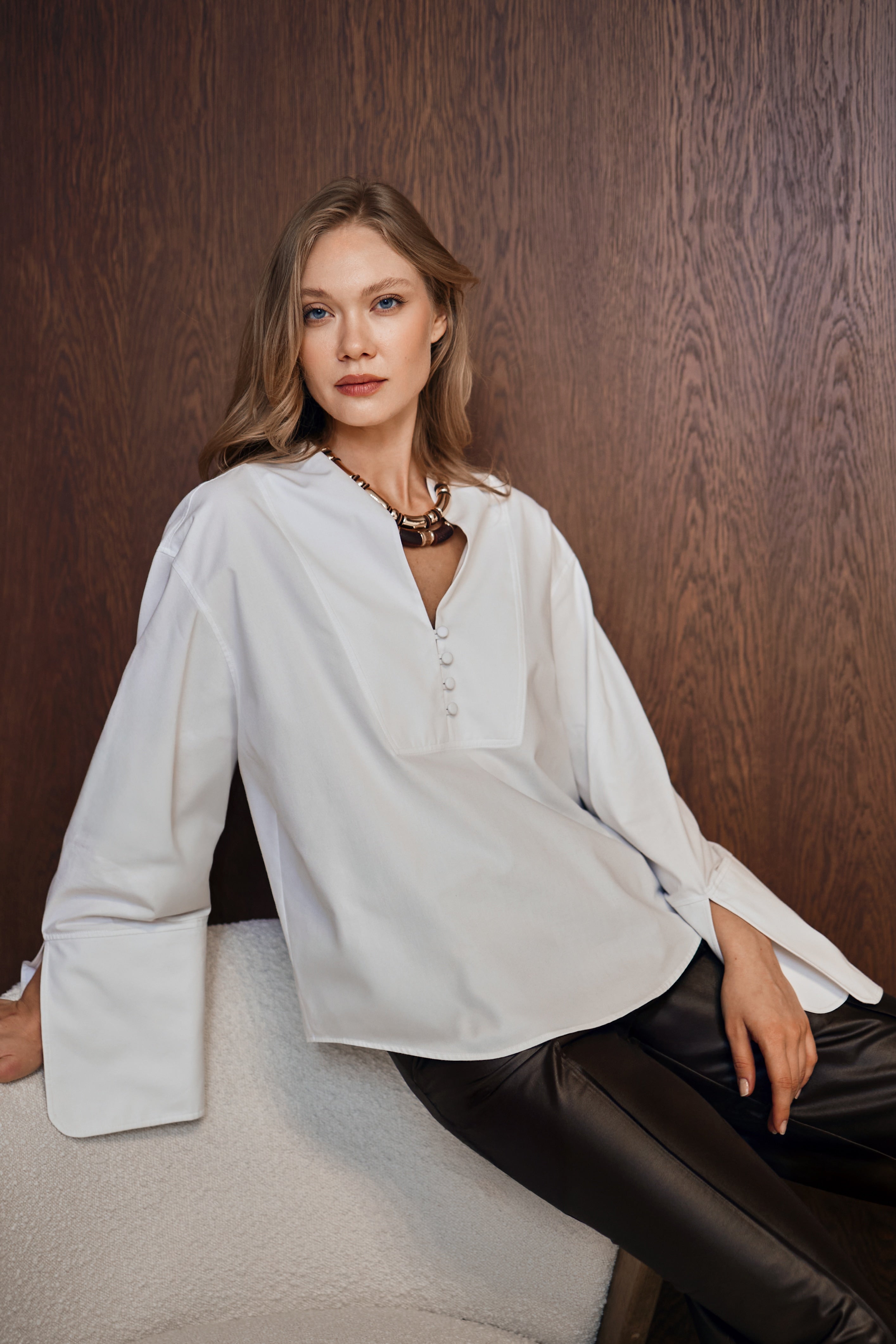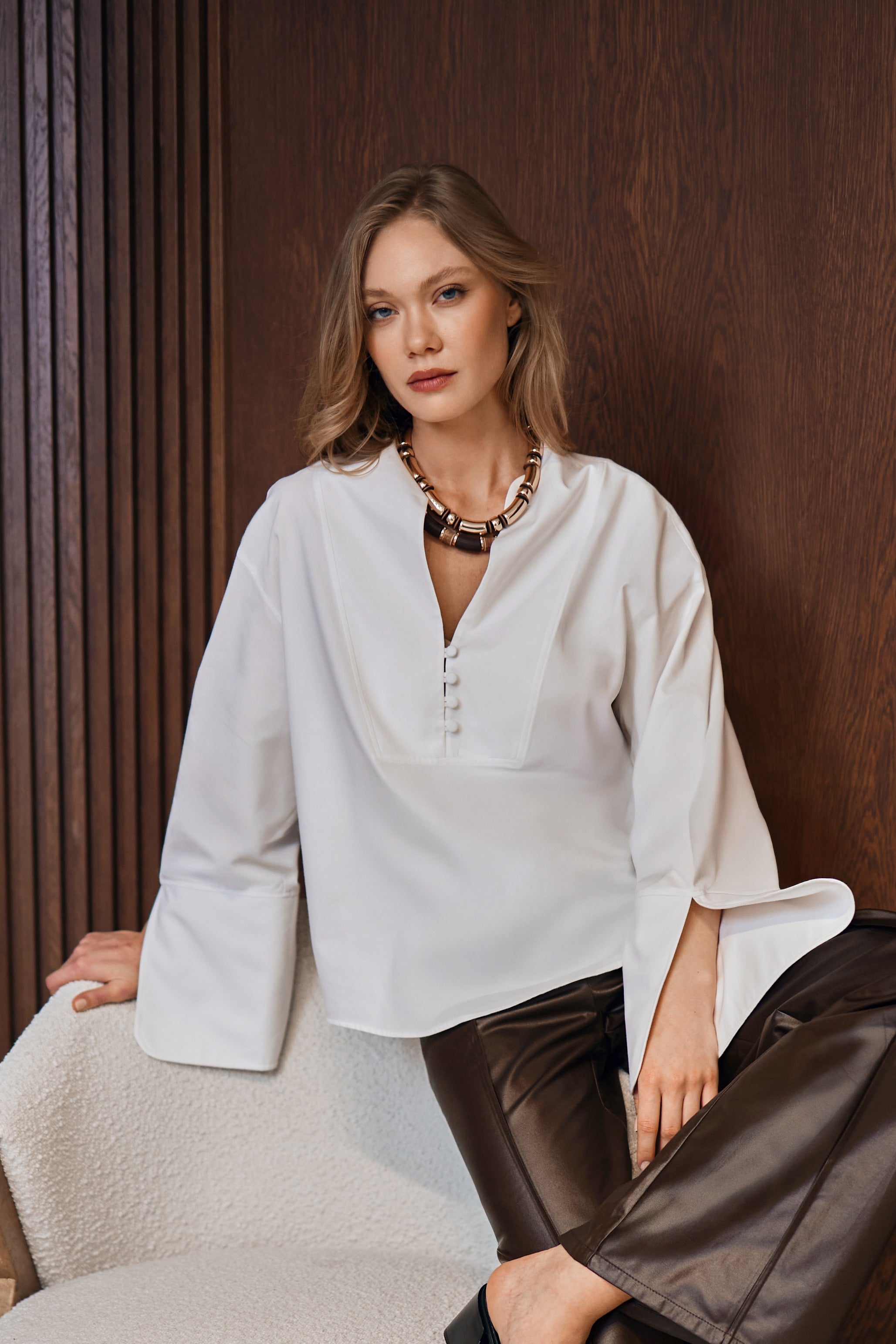 Sour Mélange beyaz gömlek; hakim yaka, büyük manşet ve geniş kesimi bir araya getirir. %100 pamuk yapısı gün boyu ferah bir his sunar. Kışlık kumaşlı dokusu daha tok durur ve iç göstermez.
