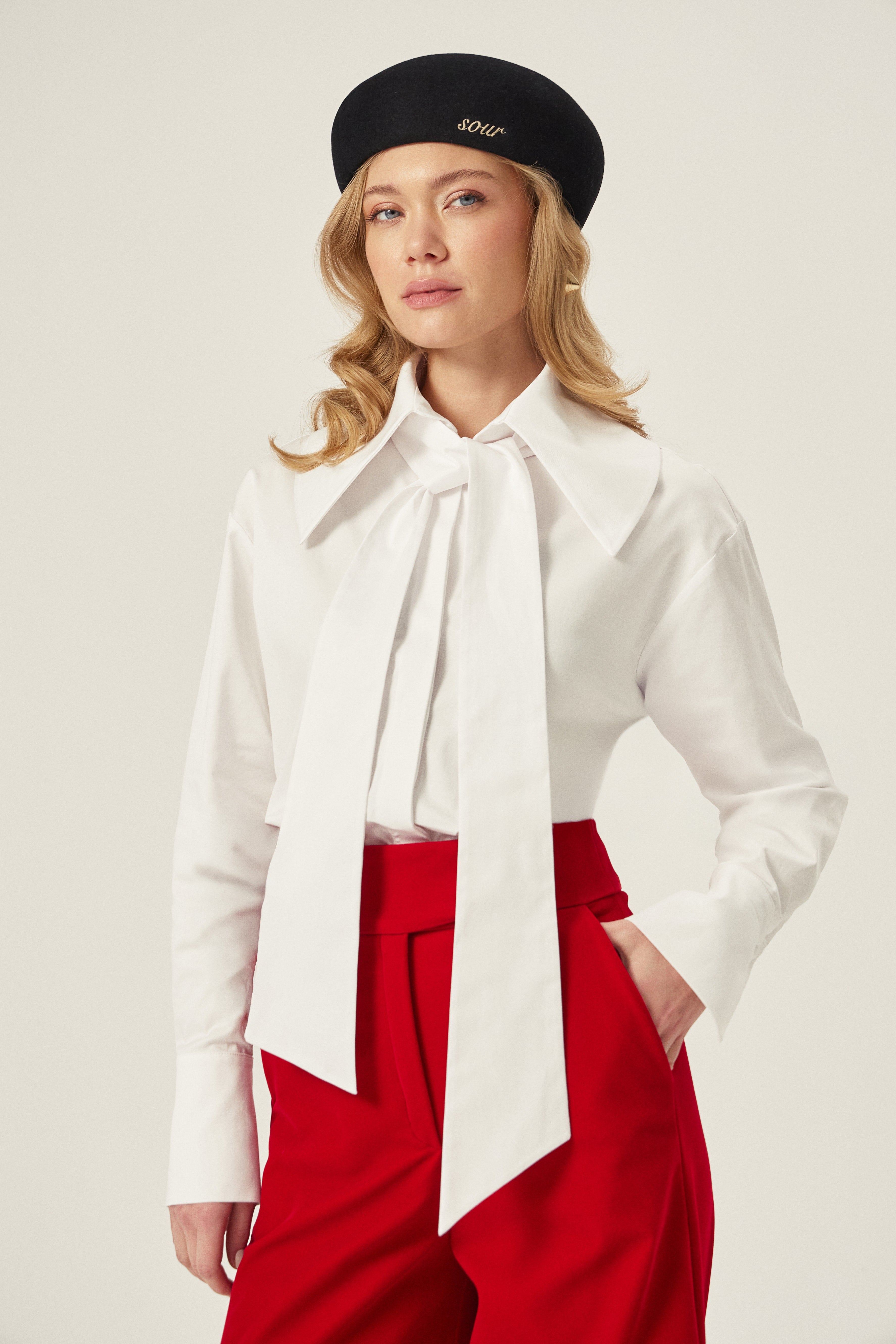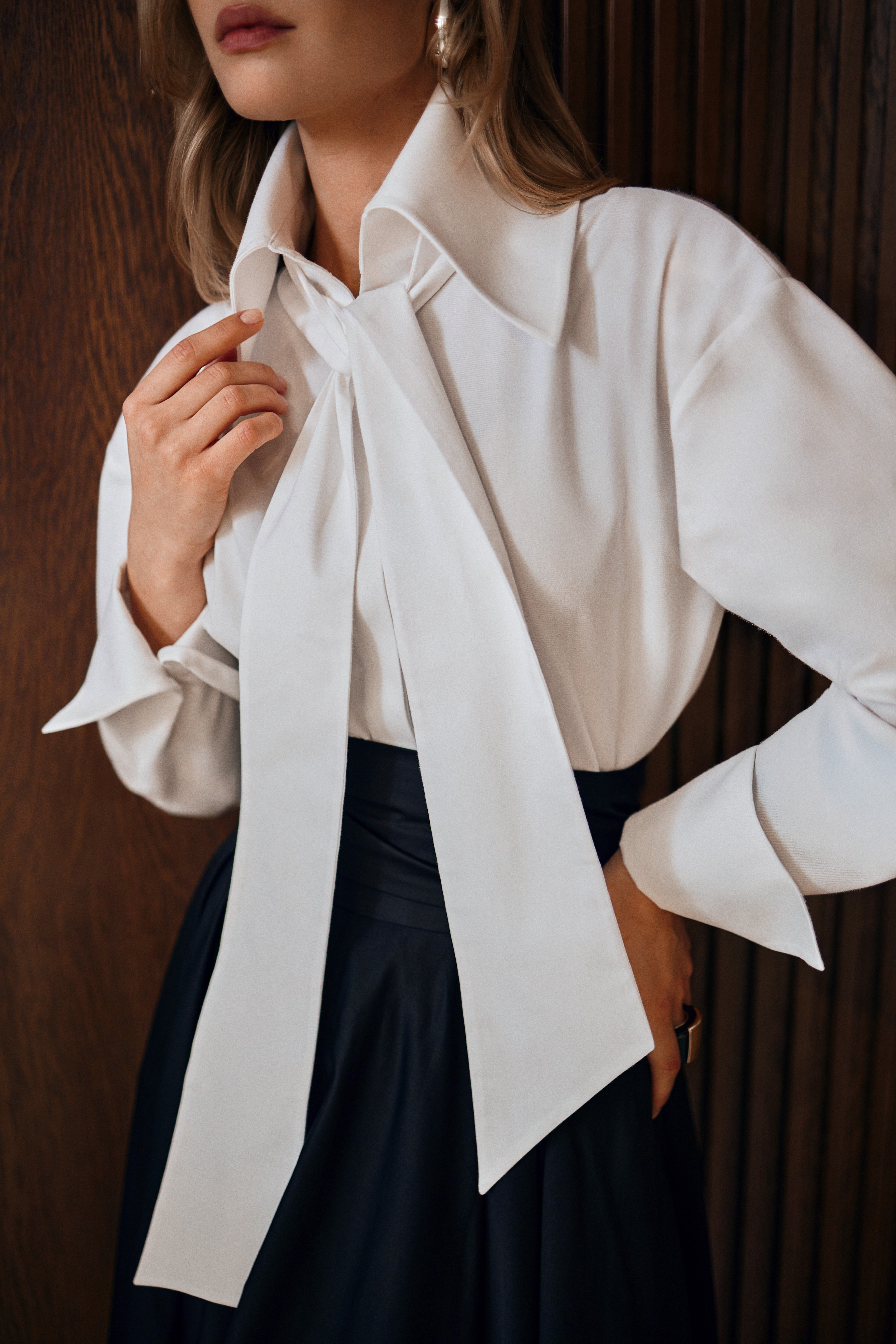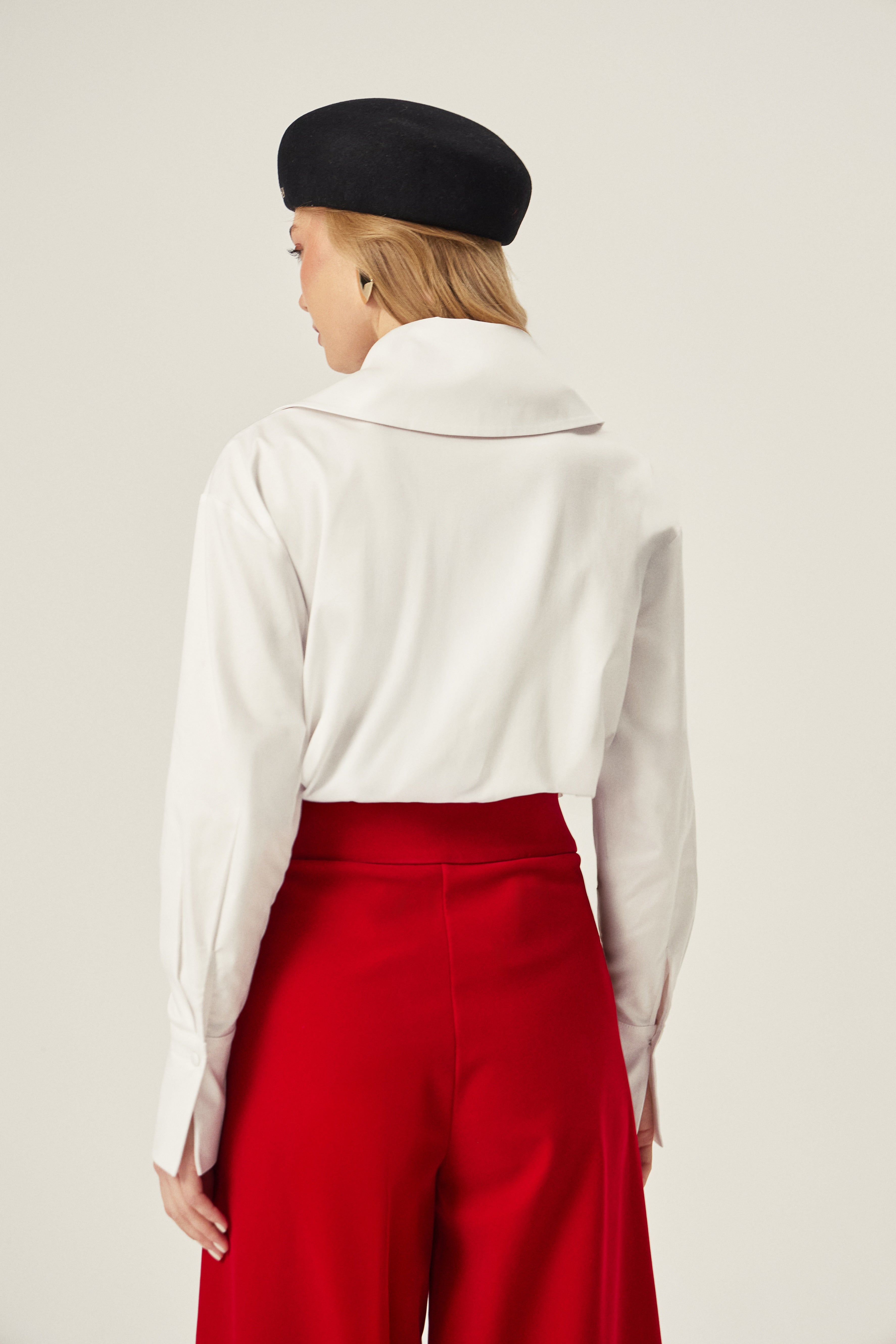 Geniş kesimi ve büyük yakasıyla net bir siluet sunan beyaz gömlek. Aynı kumaştan fuları isteğe bağlı kullanabilir, manşetleri katlayarak görünümü gün içinde kolayca değiştirebilirsiniz.Kumaşı iç göstermez.