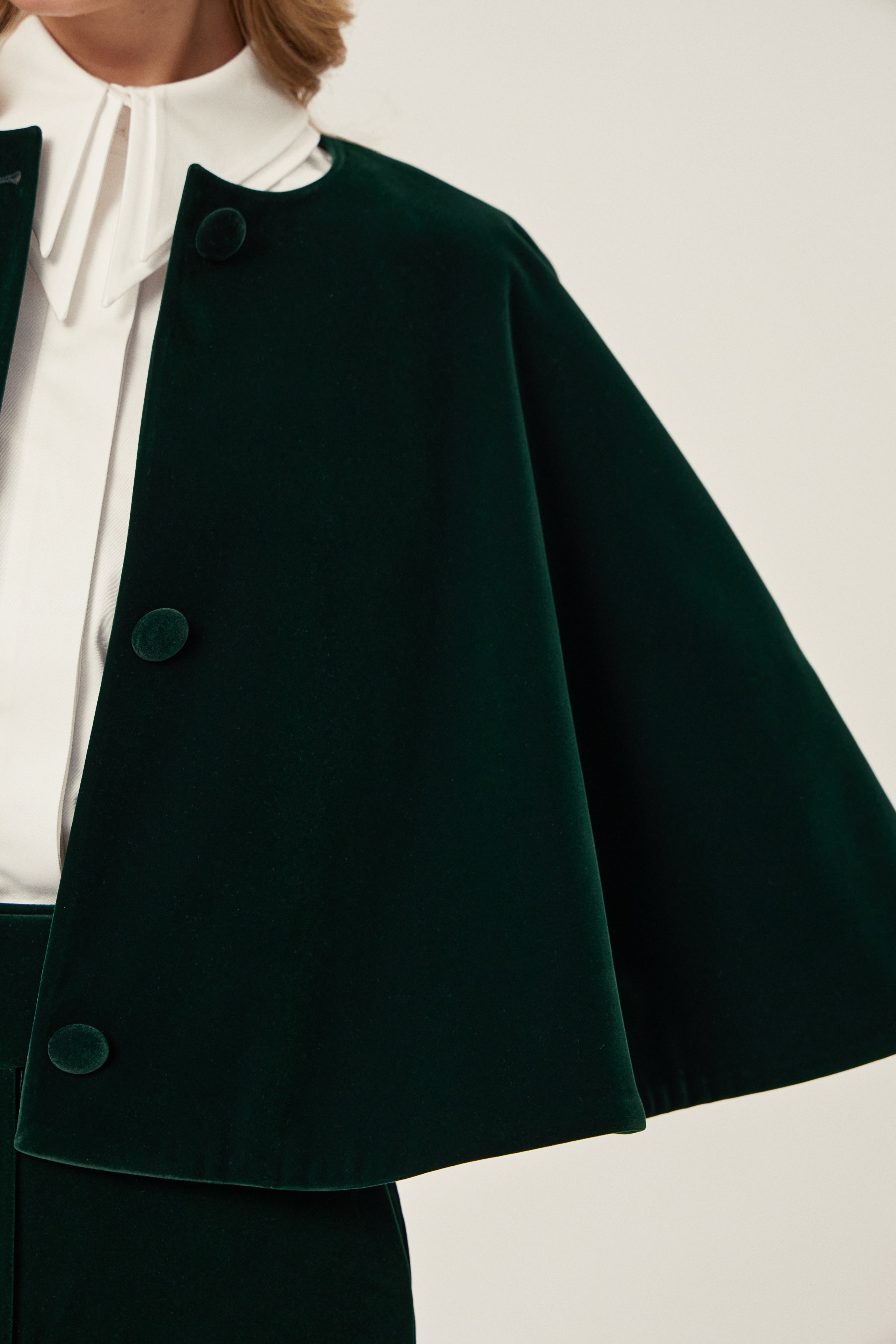 Zarafeti bir araya getiren bu tek beden pelerin, astarlı yapısıyla daha düzenli bir duruş sunar. Yeşil rengiyle gündüzden akşama farklı ortamlara uyum sağlayan, katmanlı giyimde pratik bir parçadır.